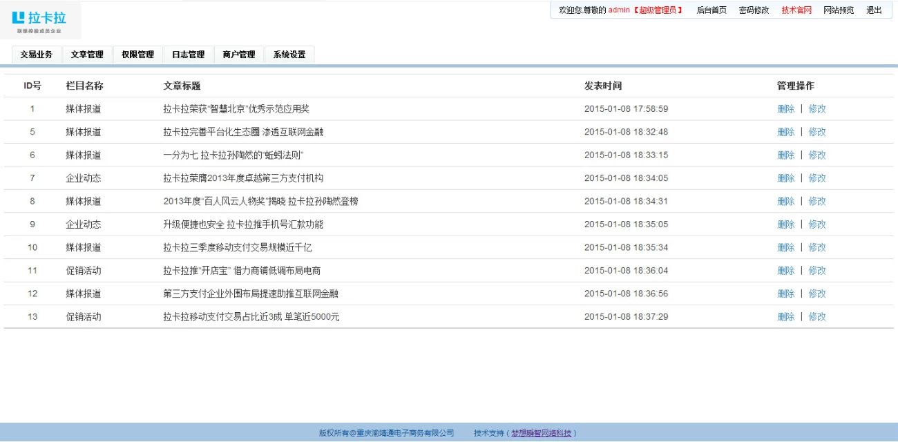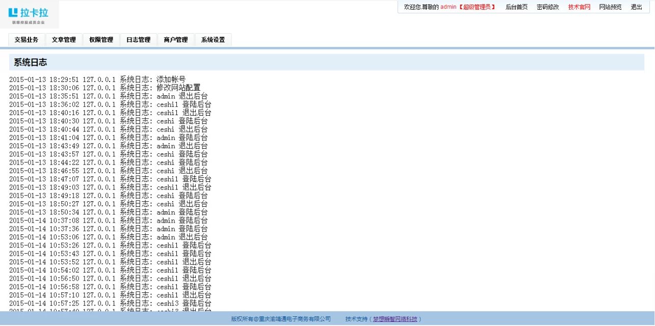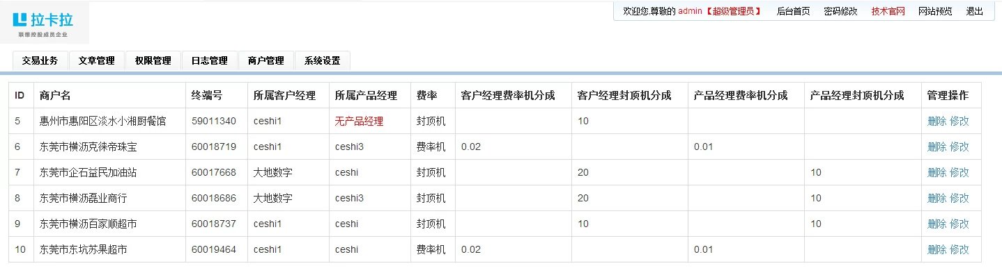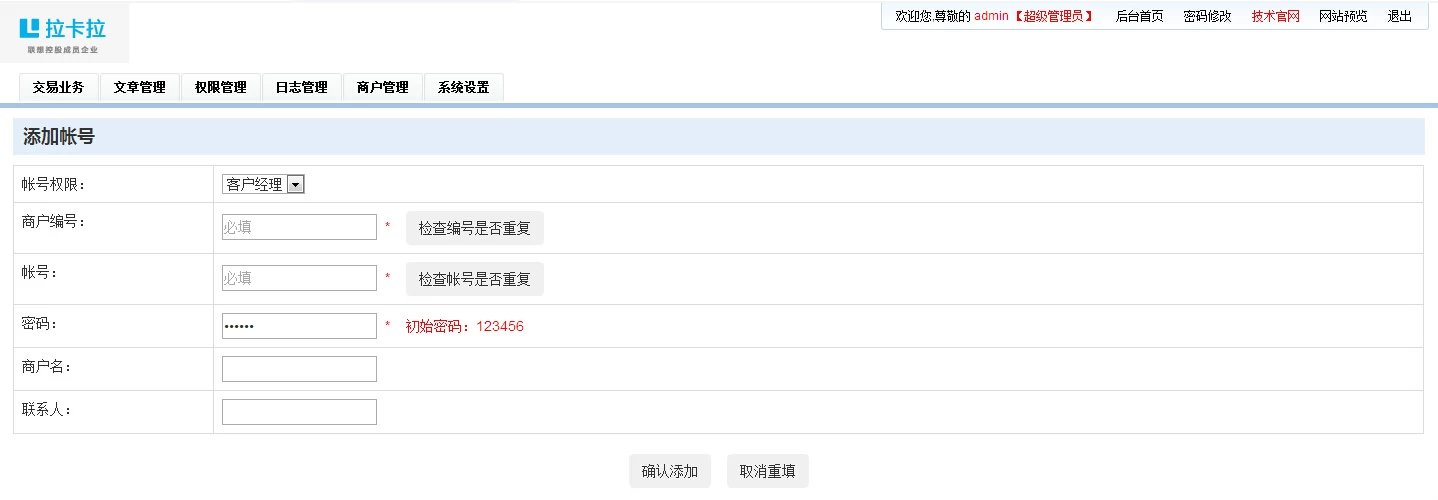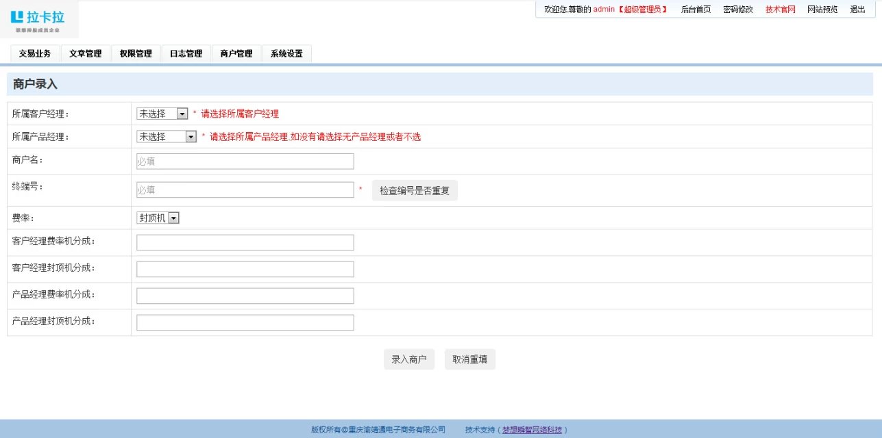 ①:系統(tǒng)網(wǎng)站設(shè)置 ②:商戶(hù)錄入 ③:系統(tǒng)日志記錄 ④:權(quán)限管理 ⑤:COOKIE防注 ⑥:SQL防注 ⑦:文章系統(tǒng) ⑧:導(dǎo)入execl.xls交易業(yè)務(wù)數(shù)據(jù),自動(dòng)生成數(shù)據(jù),自動(dòng)按分成比例計(jì)算提成,自動(dòng)計(jì)算客戶(hù)經(jīng)理和產(chǎn)品經(jīng)理總提成 ⑨:查詢(xún)功能,可按時(shí)間段查詢(xún),當(dāng)天查詢(xún),當(dāng)月查詢(xún),季度查詢(xún)等不同數(shù)據(jù)及不同帳號(hào)的總提成